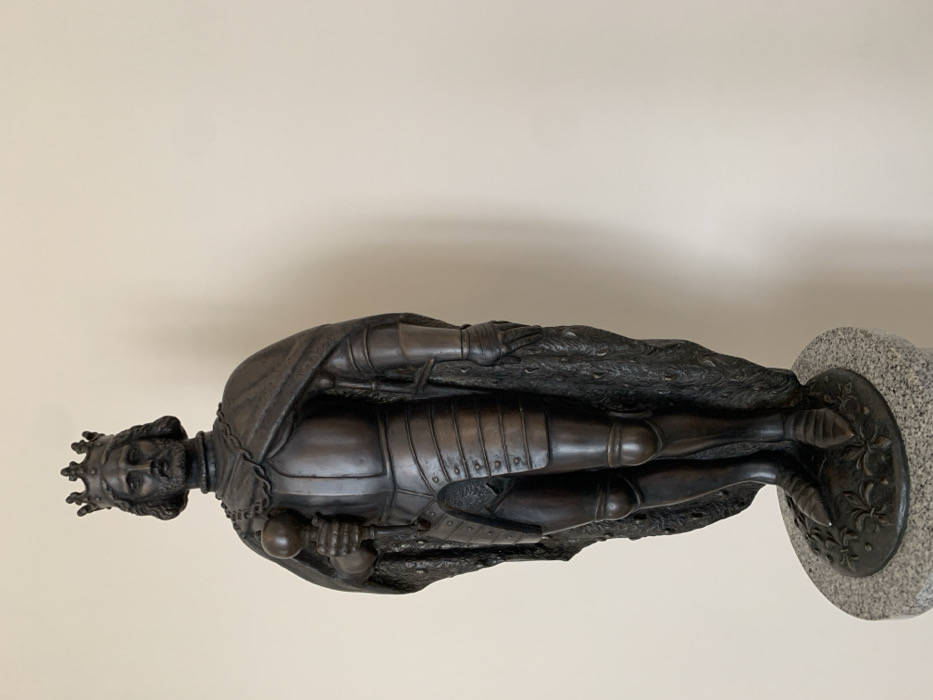 A dark bronze-toned statue of a male figure stands erect on a cylindrical light grey speckled granite pedestal against a plain, light beige wall in Nyasvizh, Belarus. The figure is depicted wearing a multi-pointed crown, a beard, and medium-length hair. He is clad in full plate armor, including a breastplate, gauntlets, and articulated leg armor. A heavy, textured cape or mantle, possibly lined with fur, is draped over his shoulders and extends down his back. In his right hand, the figure holds a scepter topped with a spherical finial. The statue's integrated base is dark-toned and features decorative relief patterns resembling stylized foliage or heraldic elements.
