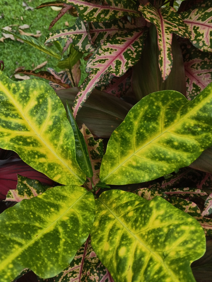 This image presents a detailed, close-up view of variegated plant foliage in Trairão, Brazil. The foreground is dominated by four broadly ovate leaves exhibiting a prominent pattern of bright green margins with irregular yellow blotches and distinct yellow venation, radiating from a central point. Interspersed and behind these leaves are narrower, elongated leaves from another plant, displaying a complex variegation of dark green, irregular pink, and maroon patterns. A patch of uniform green grass is visible in the upper-left quadrant of the frame, indicating an outdoor setting. No people, man-made objects, or actions are depicted.