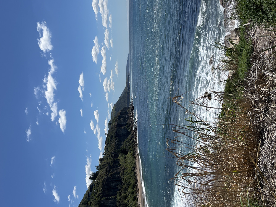 A vibrant scene presents a cliffside view. A lush, green hill descends to a narrow beach where gentle waves meet the shore. The ocean stretches towards the horizon, its surface sparkling under the sunlight. To the left, a bright blue sky is scattered with fluffy white clouds. Tall, dry grass and vegetation dominate the foreground, framing the picturesque coastal vista.