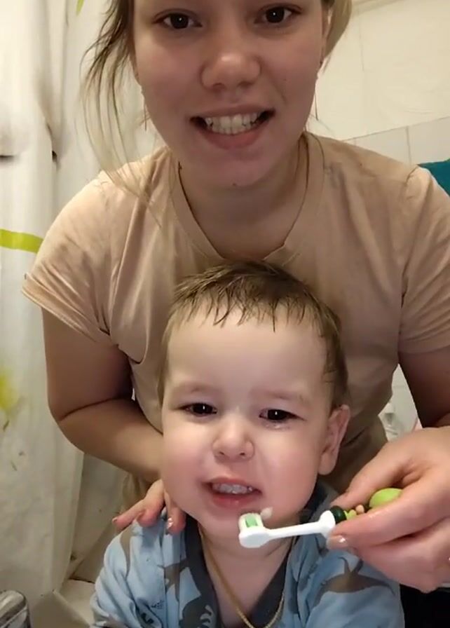 A fair-skinned young woman stands behind a baby or toddler in a bathroom, brushing the child’s teeth with a white toothbrush. The woman has her light brown hair pulled up somewhat haphazardly and is wearing a tan T-shirt. She is smiling and looking at the camera. The baby has damp, light brown hair and is wearing a long-sleeved blue shirt with a dinosaur pattern. A gold chain with a cross pendant is around the baby's neck. The baby looks up and grimaces while having its teeth brushed. The woman holds the baby with one hand and brushes with the other, as her hands are visible in the shot. A shower curtain with a white background and green leaf design hangs in the background on the left. A dark-colored towel hangs behind them. The bathroom has white tiles.
