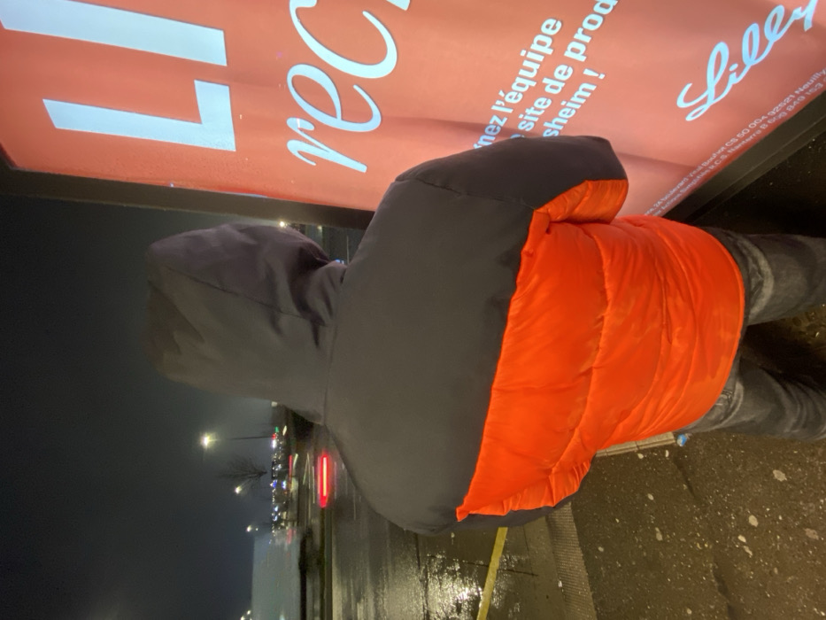 - "A person in a dark-hooded jacket with a bright orange vest stands in front of a billboard at night" by FM-WEULP2, licensed under CC BY 4.0