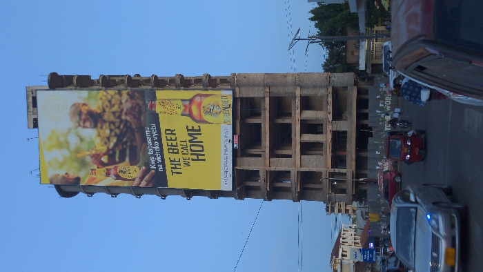 A vertical view displays an unfinished concrete building with a large advertisement for Serengeti beer