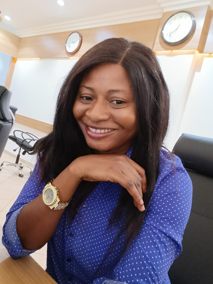 A medium-shot photograph depicts a single adult female in an indoor office setting, specified as Immigration Quarters, Nigeria