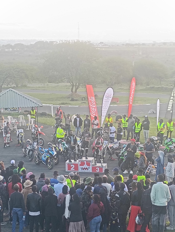 The image displays an outdoor motorcycle event on an asphalt track in Matathani ward, Kenya, under an overcast sky