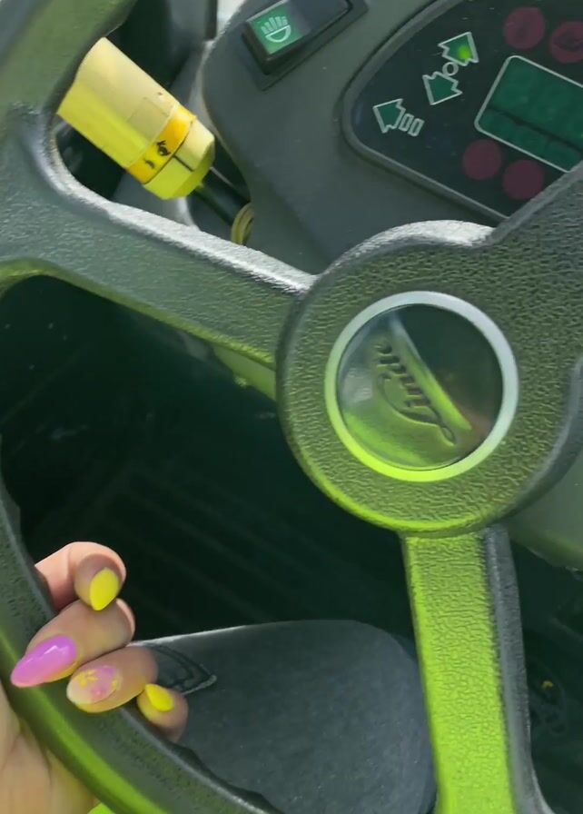 A first-person perspective video shows someone operating a Linde forklift truck on what appears to be an industrial site. The driver, wearing a yellow safety vest, has distinctive purple and yellow nails. The video shows the truck's dashboard with various controls, a small display screen, and a steering wheel bearing the Linde logo. The driver is steering the vehicle on a paved area alongside a chain-link fence. A reflection in the rearview mirror shows another forklift in the background.
