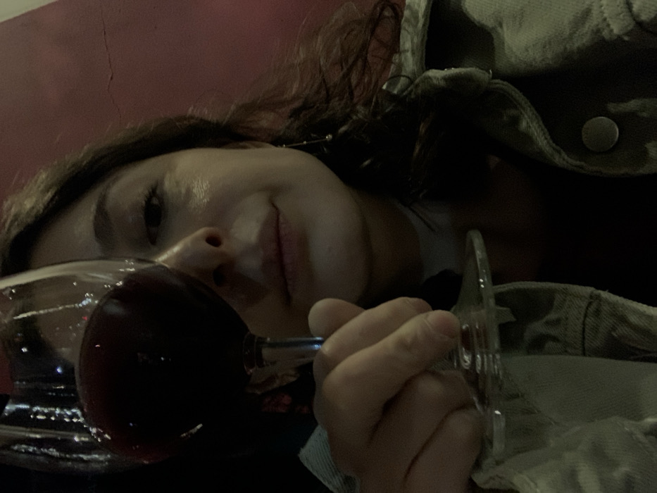 A woman leans into the camera, holding a glass of red wine. She has dark hair, fair skin, and is slightly smiling. She is wearing a denim jacket and appears relaxed. The background is a dark red color. The focus is on her face and the wine glass.