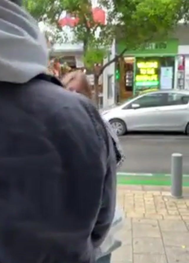 The camera pans from the street to the right, showing a sidewalk on a tree-lined street. Several pedestrians, including a young woman in an Adidas tracksuit jacket and a man in a black jacket and jeans, walk past. Parked cars and a black Vespa scooter line the street. Shops and businesses are visible in the background. The weather appears overcast.