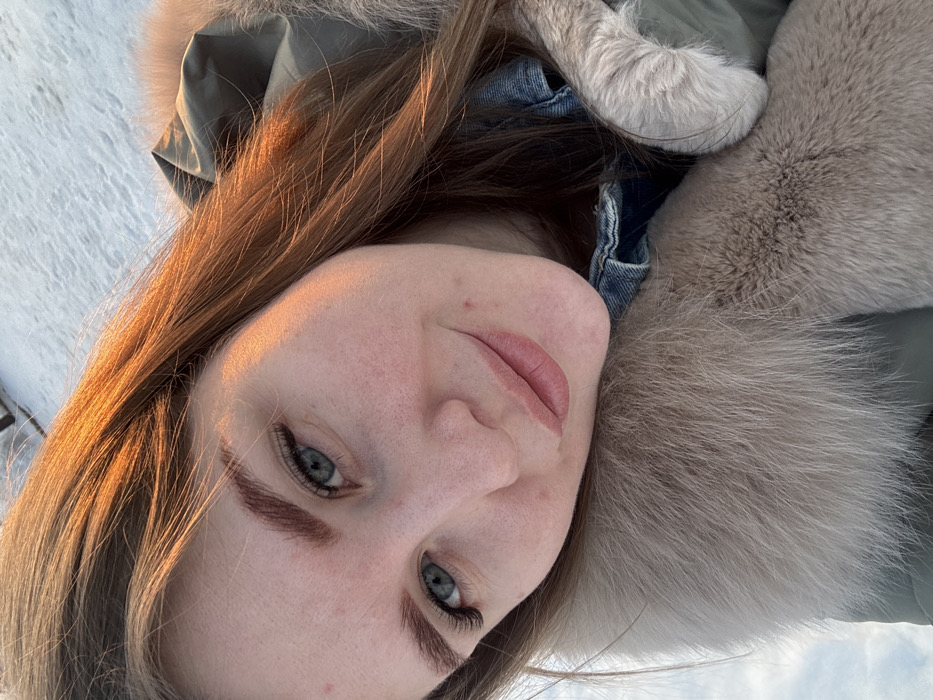 A close-up, high-angle selfie depicts a young adult female outdoors in Gornyi (Dvurechenskoe S/P), Russia, during daylight hours with warm, direct sunlight. The subject, with fair skin, light blue-green eyes, and long brown hair illuminated by golden light, looks directly at the camera with a subtle smile. Her eyebrows are dark and well-defined, and her eyelashes appear enhanced. She is wearing a muted olive-green or grey-green winter jacket featuring a light beige or pale grey fur collar/hood trim, with a denim shirt collar visible beneath the jacket. The background is a blurred expanse of snow, indicating a winter environment. Her right arm, from the viewer's perspective, is partially visible, with a hand resting near her left shoulder on the fur trim.
