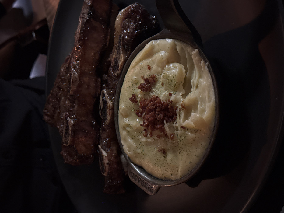 A dark plate features short ribs and mashed potatoes. The ribs are rectangular, brown, and glistening, displaying visible bones. The mashed potatoes are served in a small metal pot, topped with crumbled bacon and green herbs. The potatoes appear creamy and slightly lumpy. The overall presentation has a rustic and savory aesthetic.