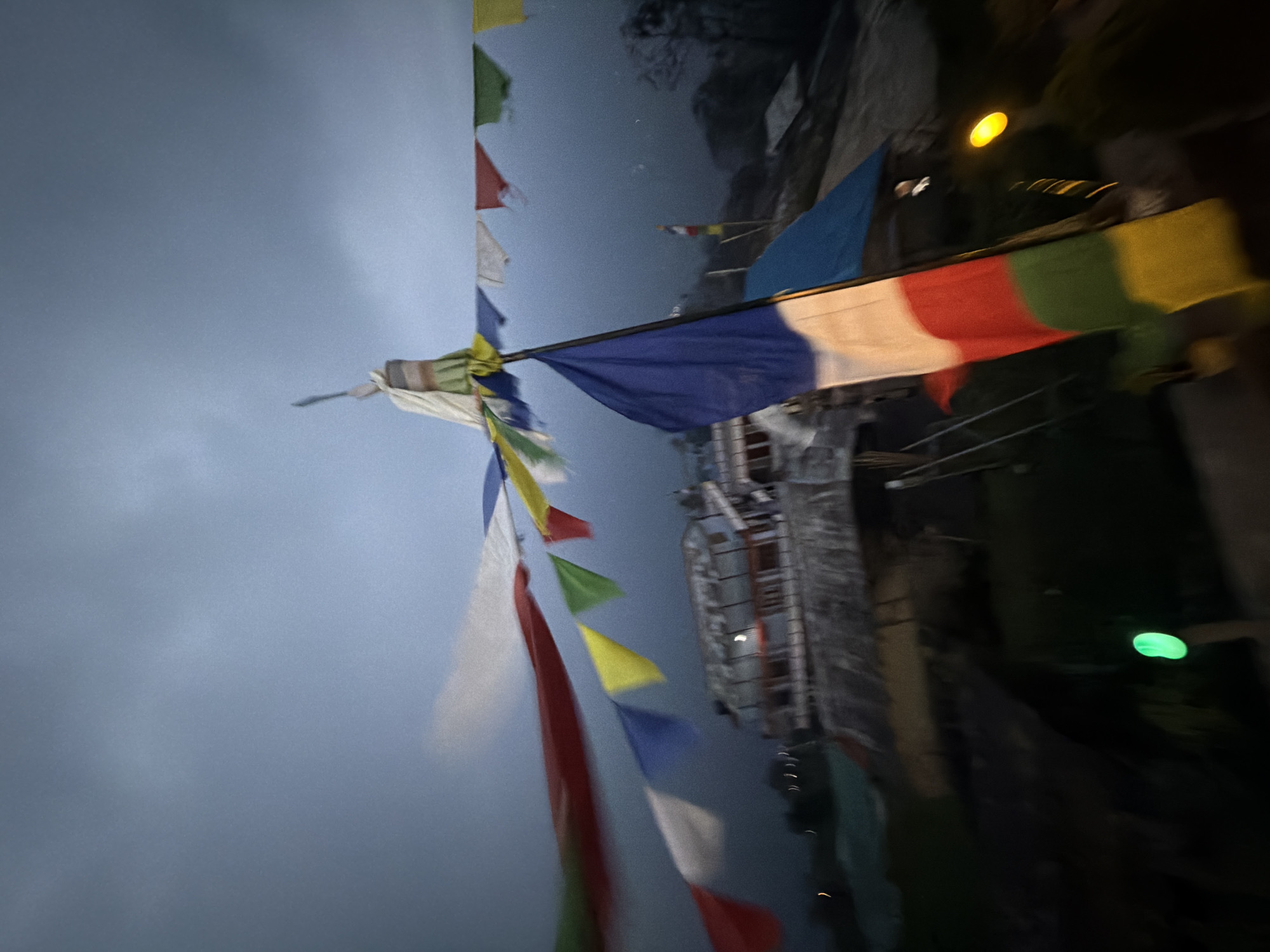 The image depicts a low-light scene in Ghandruk, Nepal, under an overcast, gray-blue sky. The foreground and midground are dominated by numerous Buddhist prayer flags, exhibiting motion blur consistent with wind or camera shake. A prominent vertical pole, positioned slightly right of center, displays a large, vertically striped flag in blue, white, red, green, and yellow. Above this pole, a horizontal string of smaller, multicolored prayer flags (red, yellow, green, white, blue) extends across the upper midground. The top of the central pole features a fabric-wrapped ornament, possibly culminating in a blade-like metallic object. In the midground, behind the primary flags, a multi-story building with white walls and dark roofs is visible, displaying windows and balconies, with one interior light source illuminated. A substantial stone retaining wall is situated below the building. To the right of the central flag pole, a blue tarp or tent-like structure is present. The background shows indistinct, hazy hills or mountains obscured by mist or low clouds. Artificial light sources include a glowing green oval in the lower-left foreground and a circular yellow light in the lower-right. No individuals are discernible within the frame. The overall scene is characterized by dim illumination and motion blur across moving elements.