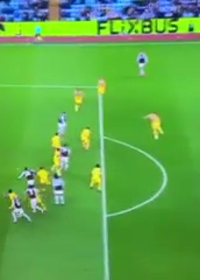 soccer game from a high angle. A player in a white and burgundy uniform has just taken a shot on goal, with the ball going into the net. The goalie is on the ground near the goal. Other players in the area raise their arms in the air. There are players in yellow and black uniforms also standing in the area. The game is being broadcast on television with a yellow ribbon in the upper right corner of the screen.