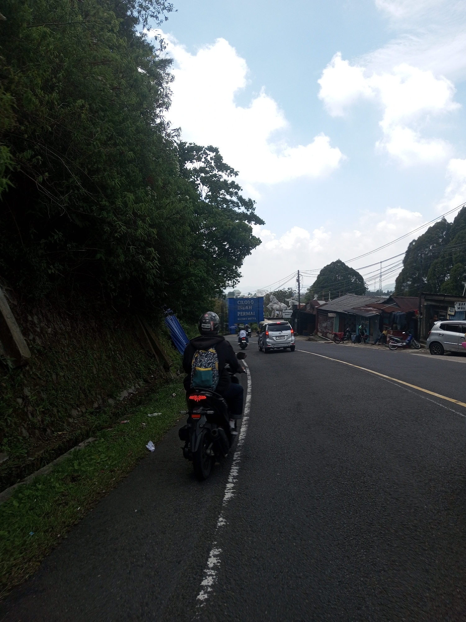 road in a rural area, possibly on the outskirts of Phonethan, Laos. The road is asphalt and has a white line marking its edge. A motorcycle with two riders is in the foreground, moving in the same direction as the camera. The rider in the back wears a helmet and a backpack. On the left side of the road, there is a steep embankment covered in dense vegetation. A ditch runs along the base of the embankment. On the right side of the road, there are buildings that appear to be small shops or residences. There are several parked cars and motorcycles along the right side of the road. In the distance, there is a blue sign with the words "CILOTO INDAH PERMAI." The sky is partly cloudy. Power lines are visible in the distance.