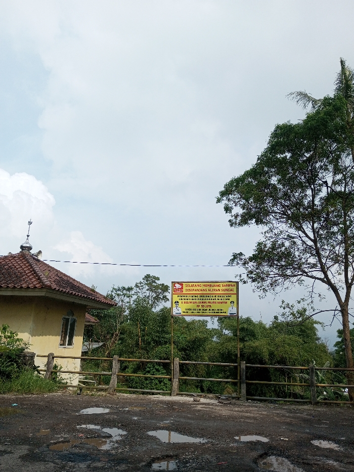The scene is located in Sandamal Eliya, Sri Lanka. The foreground consists of an unpaved, dark gray road surface heavily marked with potholes, many of which contain reflective puddles. To the left, a light yellow building with a terracotta-tiled roof is partially visible. The roof features a small, dome-like structure topped with a metal finial. A single rectangular window with a white frame is present on the side of the building. Running across the mid-ground is a rustic fence constructed from rough-hewn wooden posts and horizontal rails. Behind this fence, a large yellow rectangular sign with a red upper band is mounted on two wooden poles. The sign displays black text in an unidentifiable script, a red emblem in the upper left, and two stylized figures wearing uniforms on the lower left and right corners. Beyond the fence and sign, dense green foliage and numerous trees dominate the mid-ground and background, extending upwards. A large, mature tree with a thick trunk and a full canopy occupies the right side of the frame. The sky above is largely overcast, showing patches of light blue and white clouds. No individuals are visible in the scene.