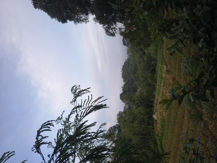 This image depicts a semi-rural landscape in Basey, Philippines. The immediate foreground features dark green foliage: feathery, pinnate leaves of a tree branch partially obscure the top-left portion of the frame, while broader dark green leaves are visible along the bottom-right. In the midground, a cultivated field or garden plot is visible, characterized by reddish-brown earth with numerous rows of small green plants. Several light-colored, arching structures, consistent with agricultural supports, are spread across this field. A small, white, tarp-like structure or makeshift shelter is situated within the cultivated area on the left. The background reveals a densely forested hillside covered with various trees and shrubs. Scattered residential structures are discernible on the distant crest of the hill amidst the vegetation. The sky is a light blue with sparse white clouds. No individuals are present in the scene.