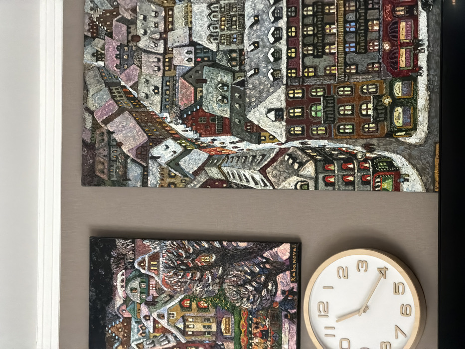 The scene displays two framed artworks and a circular wall clock mounted on a light brown textured wall within an interior space in Korolyov, Russia. A white crown molding borders the top of the wall. The left artwork is a vertically oriented painting depicting a textured, colorful winter village scene under a dark sky, likely at dusk or night. Multiple snow-covered houses with glowing windows and bare trees are visible. Small, indistinct figures are depicted in the lower left portion, near a colorful, bustling area. The artist's signature, "KabaNoval", is discernible in the bottom right corner of this painting. The right artwork is a taller, vertically oriented painting, consistent in style with the left. It illustrates a densely packed, winding street lined with snow-covered, multi-story buildings, many displaying illuminated windows. Some buildings feature balconies, and storefronts are visible at street level. Small figures are depicted on the snow-covered street. Below the left painting, a minimalist circular wall clock is partially visible. It features a light wooden rim, a white face, and raised light wooden Arabic numerals. The clock hands, also light wood, indicate a time of approximately 10:47. A dark, horizontal surface, possibly the top of furniture, runs along the bottom edge of the image. No individuals are present or actively engaged within the photographed environment; human figures are solely represented within the painted scenes.