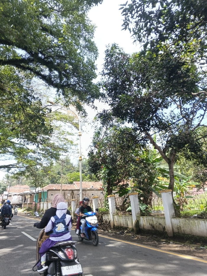 A street scene with motorbikes in motion. Two motorbikes are visible, one with two riders and another with a single rider. A stone fence lines one side of the road, bordered by trees and greenery. Houses with tiled roofs stand beyond the fence. A tall, decorative lamppost rises among the trees. The sky peeks through the branches, suggesting a bright day.