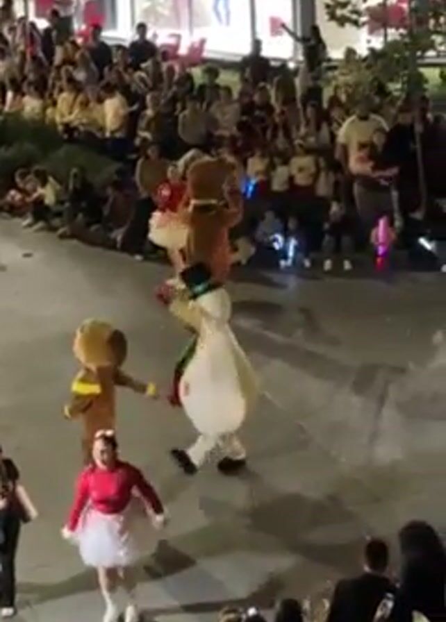 street parade at night, with people lining the sides to watch. In the foreground, there are people dressed in mascot costumes: a gingerbread man, a snowman, and a reindeer. A girl in a red outfit and white tutu dances in front of them. Behind them is a percussion marching band, dressed in red and white uniforms. Additionally, two figures on stilts, also in white, appear. The crowd is holding up phones to record the parade. The environment appears to be an outdoor shopping area with stores visible in the background.
