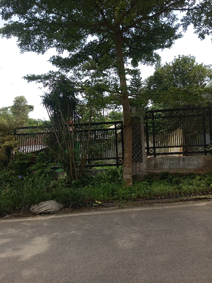 This image captures a street-level perspective in Vieng Phouka, Laos. The foreground consists of a grey asphalt road with a slight texture. Adjacent to the road, a dirt shoulder holds multiple small green plants contained in black plastic polybags, arranged in rows, along with a light-colored, irregularly shaped object in the lower-left. A black metal fence, featuring vertical bars, horizontal supports, and 'X'-shaped details, spans the midground, delineating a property boundary. This fence rests on a concrete base and incorporates a textured concrete pillar. Behind the fence, dense green vegetation partially obscures residential structures, including a corrugated metal roof on the left and a light-colored wall on the right. A prominent tree with a rough brown trunk stands directly in front of the fence, its extensive green canopy filling the upper frame against a bright sky. No individuals are present, and no actions are discernible.