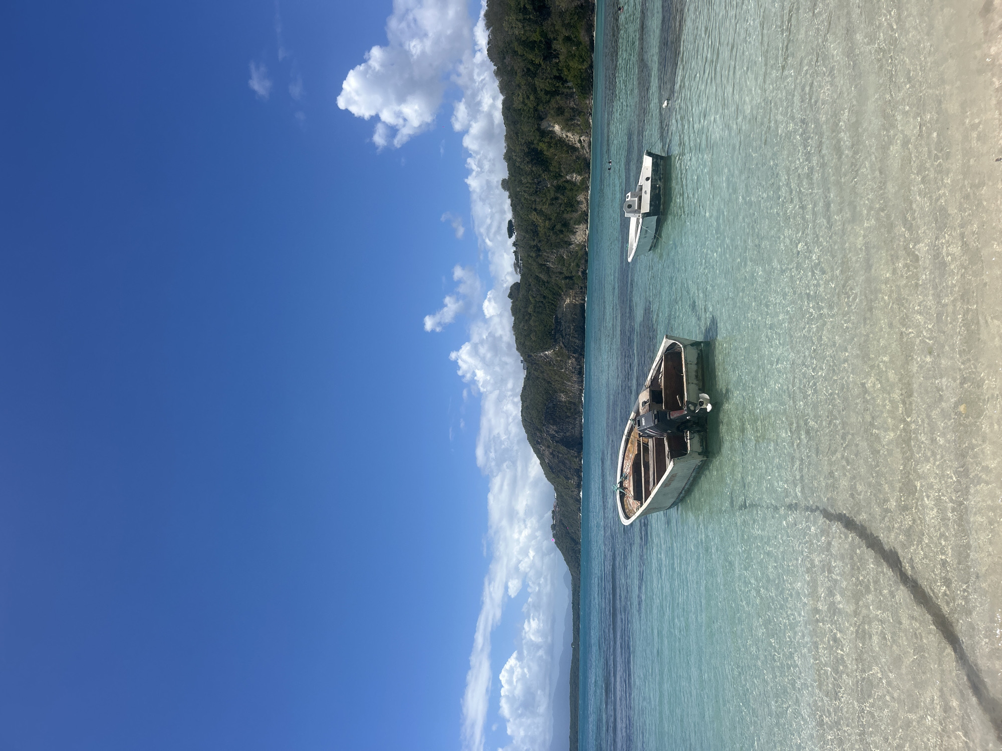 This image captures a coastal scene in Le Gosier, France, under a largely clear blue sky dotted with scattered white cumulus clouds. The background is dominated by a lush, green, hilly coastline, heavily forested with some visible residential structures on its upper slopes; distant mountains are faintly visible on the far left horizon. The mid-ground and foreground feature exceptionally clear, shallow turquoise water, revealing a light-colored sandy bottom with visible ripples and sunlight reflections. Two boats are present in the water. A light-colored, weathered dinghy, likely constructed of wood or fiberglass, occupies the central foreground. It is equipped with a dark-colored outboard motor mounted at its stern, with the propeller submerged. A dark line, presumed to be an anchor chain or rope, extends from this boat towards the bottom-left of the frame, casting a distinct shadow on the sandy seabed. Further back and to the right, a second, smaller white boat with a dark stripe along its hull is moored. Several dark, ambiguous shapes, consistent with human figures swimming or wading, are discernible in the water near the right side of the distant coastline.