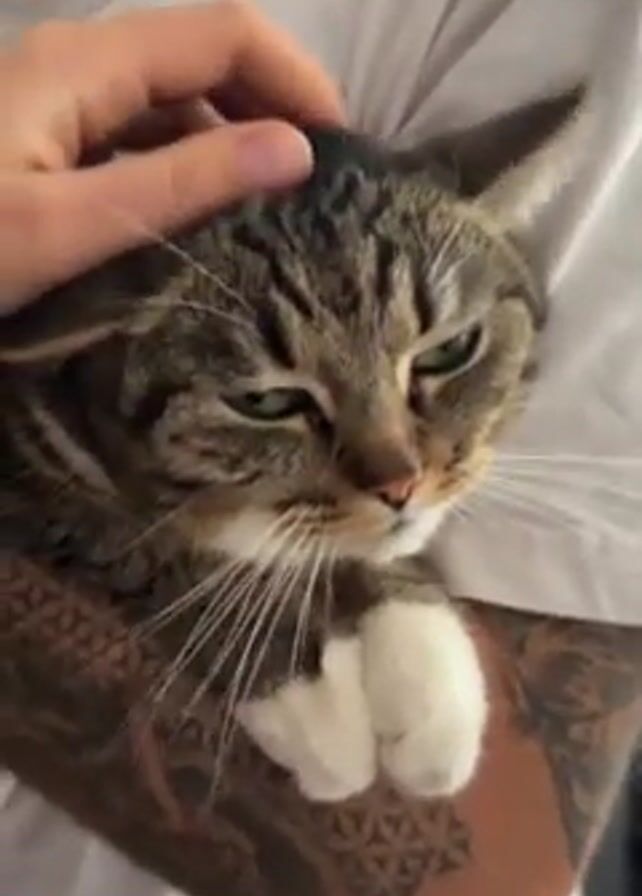 A person wearing a white t-shirt holds a tabby cat in their arms, while petting its head. The cat has white paws and its face appears squinty and slightly annoyed. The person has tattoos on their left arm. The background is blurred.