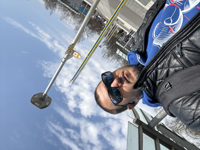 The image, captured in Überlingen, Germany, shows a male subject taking a selfie outdoors on a bright, partially cloudy day. The subject, in the foreground and tilted right, has short dark hair and a beard, wearing reflective blue sunglasses, a black quilted leather jacket, and a blue hooded sweatshirt with a white graphic design featuring red accents and X-shaped eyes. A black backpack is visible on his left shoulder. The background reveals an urban environment, likely a public transit stop. To the subject's right, a silver lamppost with a flat, square top stands beside a thinner silver pole and a yellow and blue striped pole, the latter featuring a small yellow and white directional sign. Above and behind the subject, the structural elements of a shelter, including metal framing and translucent panels, are visible. The ground is paved with light-colored material. Leafless deciduous trees and indistinct figures are present in the distant background.