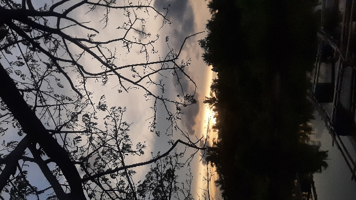 The image displays an outdoor environment in Lhokseumawe, Indonesia, captured during either dawn or dusk. The upper portion of the frame features a sky exhibiting a gradient from light grey-blue overhead to a strong yellowish-orange glow along the horizon, partially obscured by dark grey cloud formations. Silhouetted against the sky in the immediate foreground are numerous tree branches, largely devoid of leaves, extending across the top and upper-middle sections of the composition. Below the horizon, a dense band of dark green and black vegetation, including distinct palm tree silhouettes, spans the width of the image. The lower third of the scene is occupied by a calm body of water, reflecting muted light from the sky and the dark forms of the vegetation. Within the water, in the lower right quadrant, are visible several rudimentary floating structures, appearing to be constructed from dark poles or timber configured into rafts. Two dark, barrel-like objects are integrated into these floating structures. No human figures are discernible within the frame.