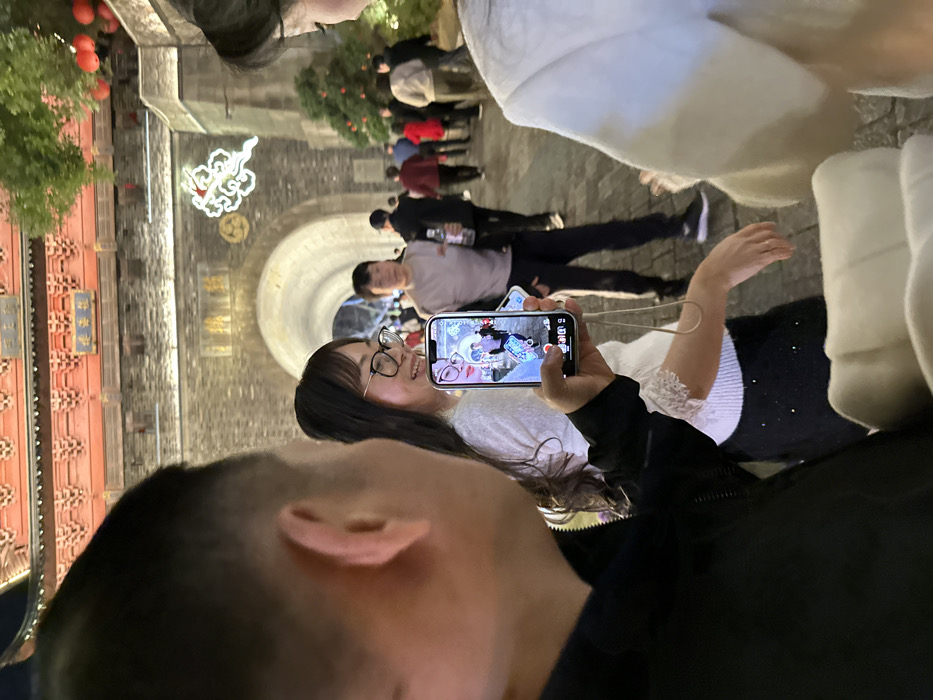 An outdoor evening scene depicts individuals interacting near the historic Qinghefang gate in Shangcheng District, Hangzhou, China