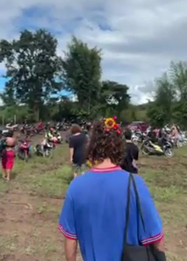 dirt field filled with parked scooters and some cars. Several people are walking around the field, mostly dressed in casual summer clothing. The sky is blue with scattered clouds, and there are trees surrounding the open area. The ground is muddy and shows tire tracks from the vehicles.