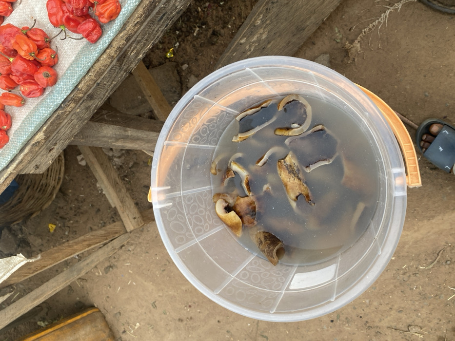 A bucket of cow skin sits on the ground, soaking in murky water. Nearby, red scotch bonnet peppers are displayed on a wooden surface. The overall scene appears to be a marketplace setting, possibly in an area where these ingredients are commonly sold and used in cooking. A single slipper is visible in the lower right corner.