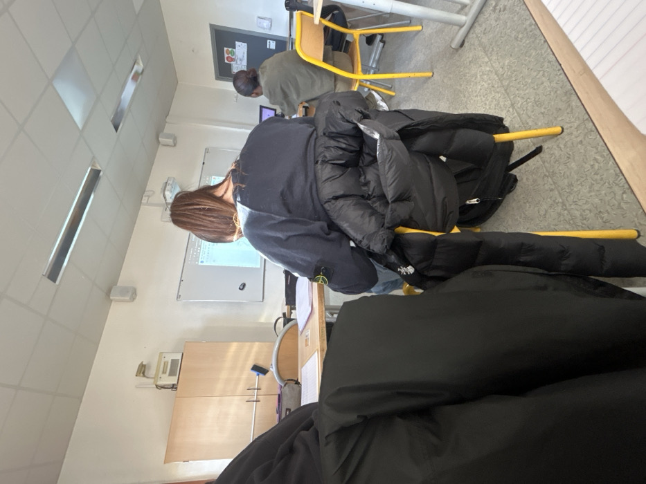 This image depicts a classroom in Schiltigheim, France. In the immediate foreground on the left, a black jacket hangs, partially obscuring the view. Centrally positioned, a female individual with brown hair tied in a high ponytail is seated at a light-colored wooden desk, facing away from the camera. She wears a dark long-sleeved top, with a circular badge visible on her left bicep. A black puffer jacket is draped over the back of her yellow-framed chair. Papers or notebooks are visible on her desk, and her hands are positioned as if engaged with materials on the surface. Further back and to the right, another individual with dark hair styled in a bun is seated at a similar desk, wearing a khaki-colored long-sleeved top and facing an open laptop with an illuminated screen. This individual is also seated on a yellow-framed chair. The classroom features light-colored walls and a suspended ceiling with recessed fluorescent lighting panels and white surface-mounted speakers. A large white board is mounted on the far wall, displaying a projected image containing text and graphical elements. To the left of the whiteboard, light-colored wooden storage cabinets are visible, with an older model radio or electronic device placed on top. The floor is covered in a light grey, possibly tiled or linoleum, material. Sunlight streams into the room from the left, casting shadows on the cabinet and desks. A light blue door with colorful shapes attached to it is visible on the far right wall.