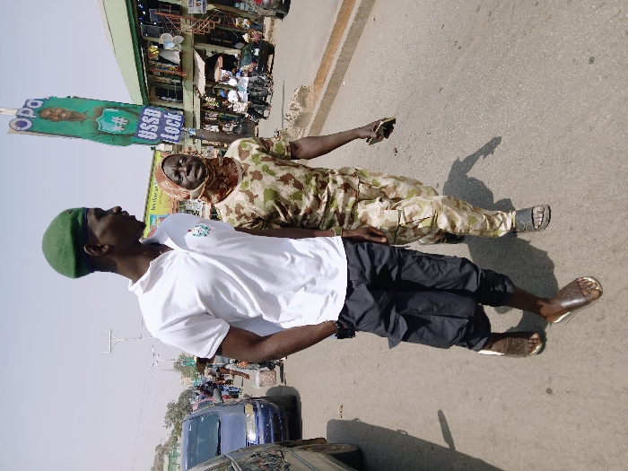 Two individuals walk on a paved street under clear, bright skies. On the left, a tall male wears a green beret, a white short-sleeved polo shirt with a small green and white emblem on the left chest, dark grey or black three-quarter length cargo pants, and brown open-toe sandals. His left hand is partially in his pocket, and he looks to his right. To his right, a shorter individual, presenting as an older adult, wears a camouflage pattern (tan and green) long-sleeved shirt and pants, a brown and tan patterned head covering that exposes the face, and dark grey open-toe sandals. This individual holds a small, light-colored object in their right hand and looks generally forward. Behind the two main subjects, on the right side of the street, a tall vertical billboard stands, displaying the text "OPA" at the top, a smiling male face, and text including "#" and "USSD Lock". Further into the background, a multi-story building with visible windows and hanging items is present. A dark blue minivan or similar vehicle is partially visible on the far left, in the background. Other indistinct figures are scattered throughout the mid-ground and background, suggesting a public, populated urban area. Shadows of the main subjects are cast on the road, indicating strong sunlight.