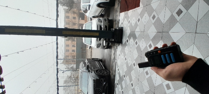 A hand holds a black pager with blue buttons, positioned to the right. The scene is viewed through a storefront, with a metal security bar visible. Three cars, two white and one black, are parked outside on a wet, tiled surface. A building is visible in the background, under an overcast sky. The tile pattern is prominent, with gray diamonds and squares.