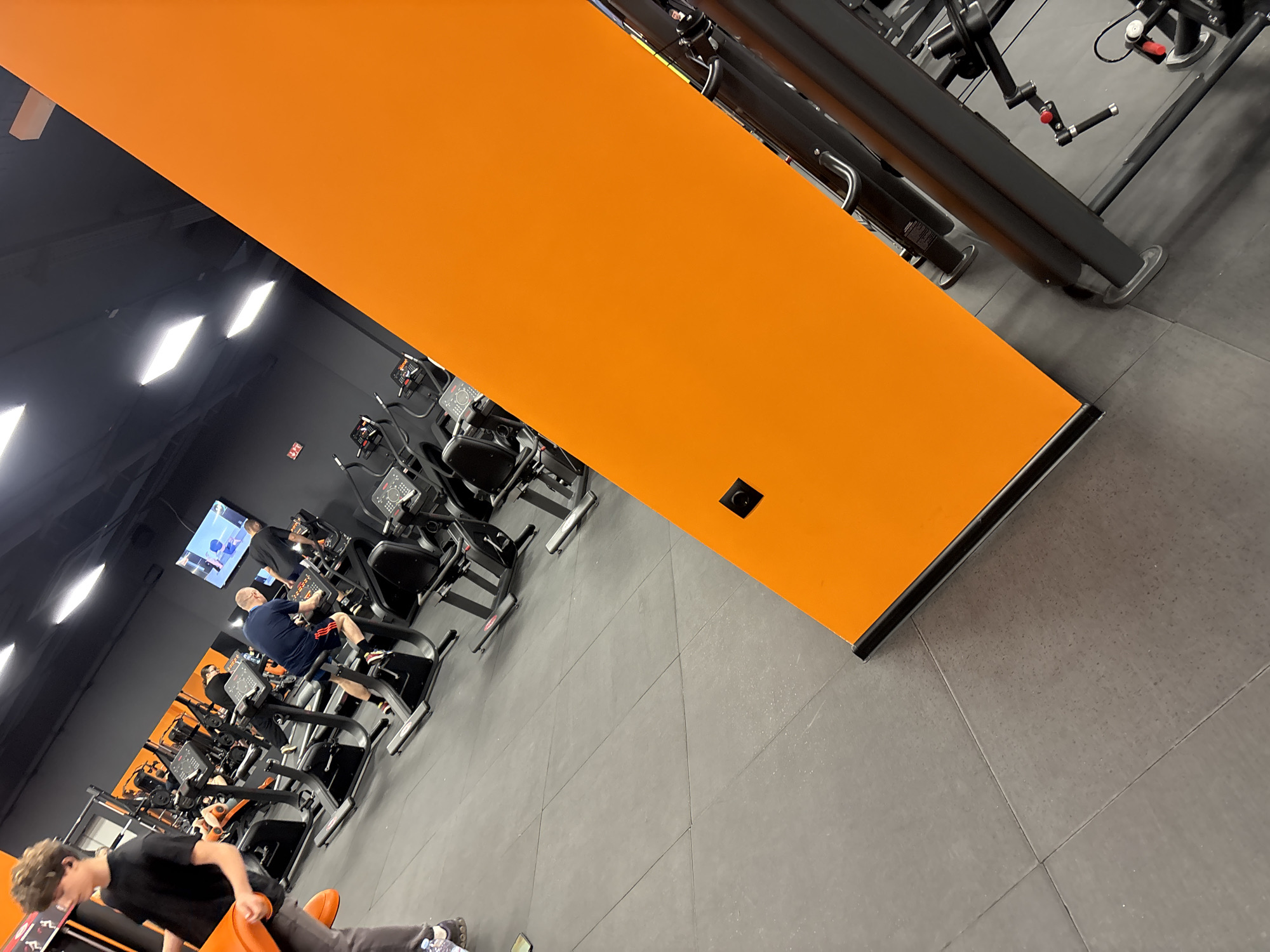 interior of a gym, possibly in Plovdiv, Bulgaria. The gym has a dark gray floor and ceiling with white lights. A large orange wall spans the right side of the frame. Several rows of elliptical machines are lined up, with individuals using them. At the bottom of the frame, a person is visible near workout equipment. A television screen is visible in the upper left of the frame.
