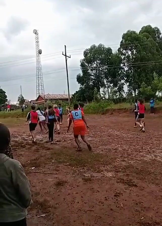 A group of young adults and teenagers are playing netball on a muddy, red dirt field