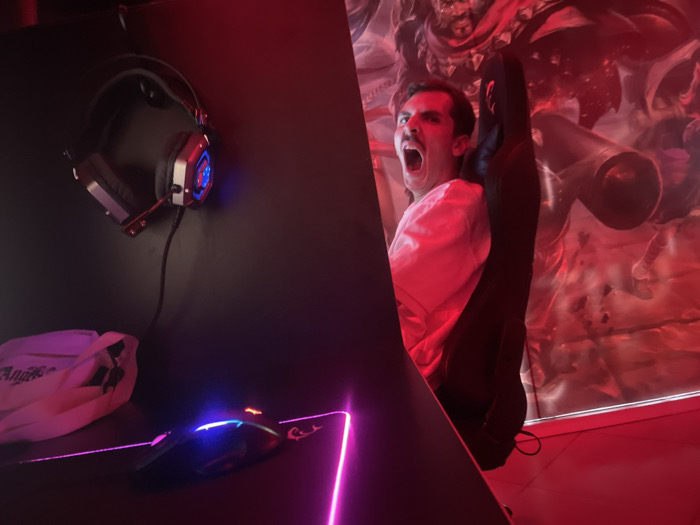 The scene depicts an indoor gaming environment, located in Budva, Montenegro. An adult male with dark hair and a mustache is visible from the chest up, seated in a black gaming chair. He is wearing a light-colored shirt, appearing light pink due to the predominant red illumination. His head is slightly tilted, and his mouth is wide open in a pronounced expression, indicative of shouting or an intense reaction. His right leg is raised, with the foot resting against the chair's backrest. The background features a wall dominated by a large, red-illuminated mural depicting a detailed, aggressive fantasy or monstrous figure. In the foreground, a dark-colored desk is present. A pair of black gaming headphones with blue and red LED accents hangs from the left side of the desk, its cable extending downwards. On the desk surface, a black gaming mouse with multi-colored LED lighting rests on a rectangular mouse pad, which is bordered by a continuous pink LED strip. Adjacent to the mouse, a crumpled, translucent pink plastic bag is visible. The entire scene is bathed in a strong red ambient light, supplemented by neon illumination from the gaming peripherals.