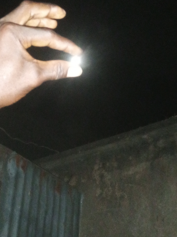 A dark-skinned hand holds a bright light source, appearing as a small, intense glow between the thumb and forefinger. The background is predominantly dark, suggesting a nighttime or low-light environment. Below the hand, a weathered, corrugated surface is partially visible, likely a wall or roof. The overall scene presents a stark contrast between the concentrated light and the surrounding shadows, evoking a sense of mystery.