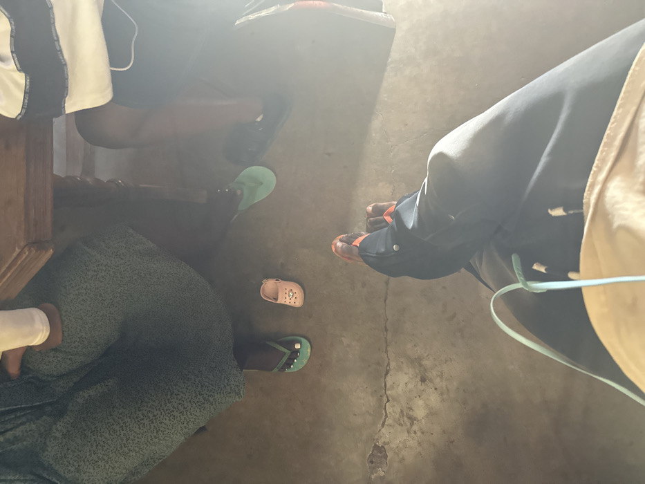 A high-angle photograph depicts the lower extremities of three individuals and a wooden table on a light grey concrete floor in Jos, Nigeria