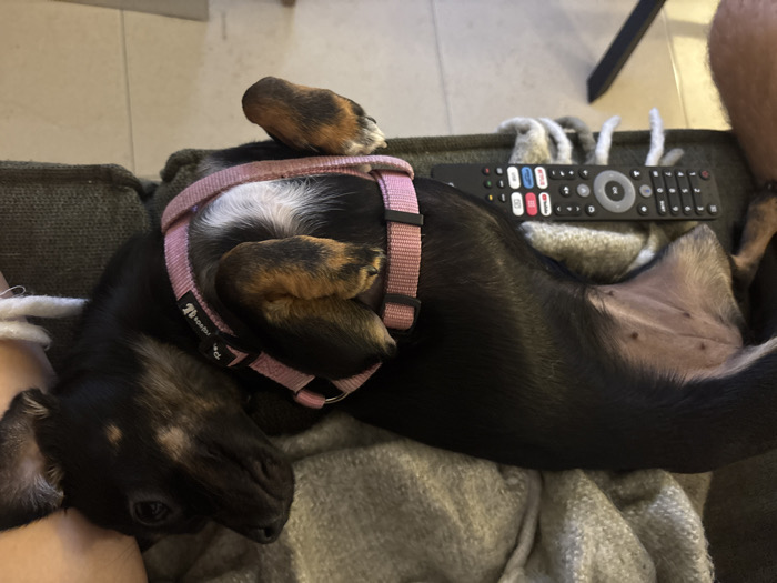 - "A small, black and tan dog, wearing a pink harness with a visible "Sonka" brand label, is positioned lying on its back, inverted, on a textured grey blanket" by FM-0RDsi1, licensed under CC BY 4.0