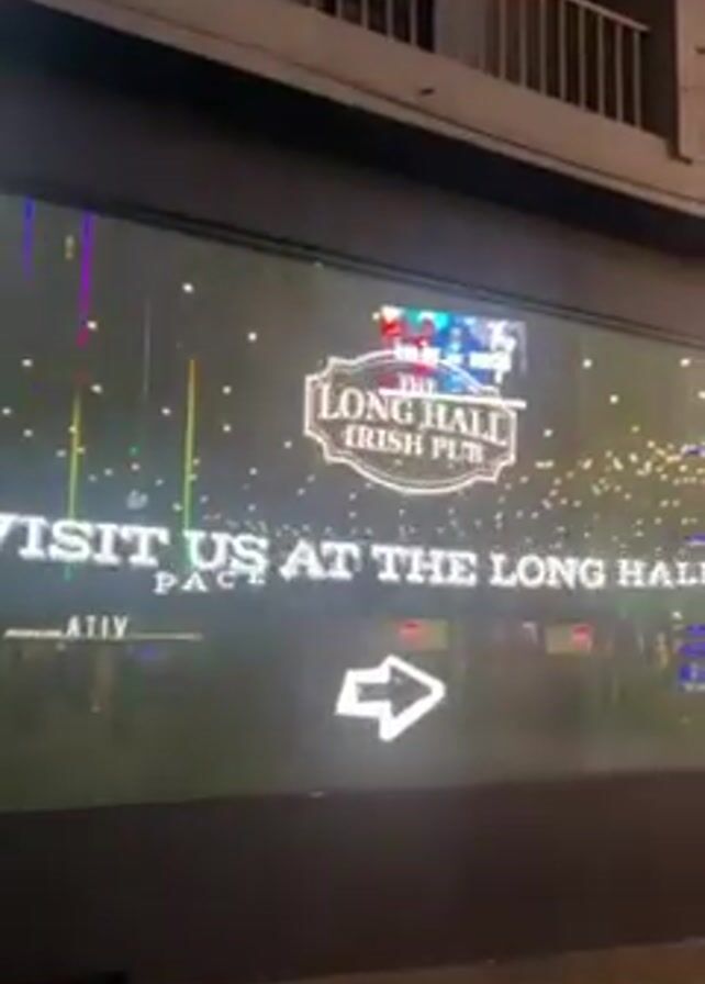 night scene in Paceville, St Julian's, Malta. It begins with a close-up of a large outdoor LED screen advertising "The Long Hall Irish Pub." The screen displays an image of a champagne flute held by a hand, followed by the pub's logo and an invitation to visit, with an arrow indicating the direction. The camera then pans out to reveal the street scene. The street is paved and decorated with overhead string lights creating a festive atmosphere. Several people are walking around, some in groups. Buildings line the street, and signage for other establishments is visible. The overall impression is that of a lively nightlife area.