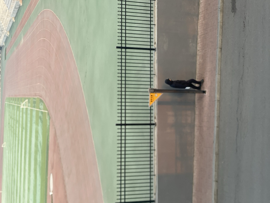 The image depicts an outdoor stadium environment in Zhongtun, China. In the background, a green grass field with faint white markings and a reddish-brown running track with multiple lanes are visible. The stadium appears empty. A black metal fence with vertical bars separates the stadium grounds from a lower level. Below the fence is a grey concrete wall. On a reddish-brown paved sidewalk adjacent to the wall, a single individual walks from right to left. The person is dressed in dark clothing, including a hooded jacket that obscures their face, and carries a light-colored object in their left hand. To the left of the person, a yellow triangular sign mounted on a dark pole is present on the sidewalk. The sign displays Chinese characters, specifically "安全第一" (Safety First) and "禁止攀爬" (No Climbing). A dark grey asphalt road is partially visible in the immediate foreground, running parallel to the sidewalk.