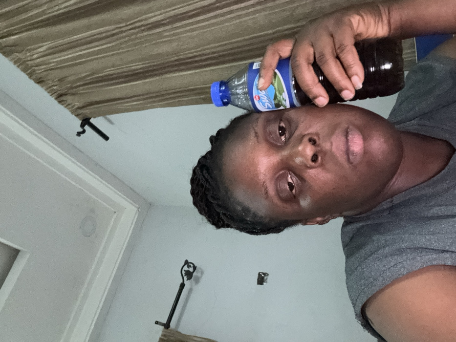 A person holds a bottle of dark liquid on their forehead. The individual has braided hair and wears a gray shirt. Behind the person is a light gray wall with a decorative metal object and an electrical outlet. A white doorframe is visible on the left. A curtain is at the top of the frame.