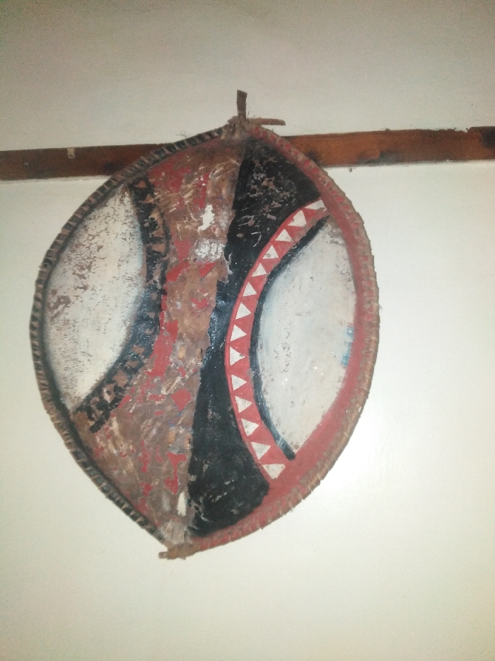 A leaf-shaped shield hangs from a wooden beam against a white wall. It's decorated with tribal-style patterns in white, red, and black. A vertical band of red and brown runs down the shield's center, flanked by areas of black. A red outline frames the edge, punctuated by white triangles. The shield looks aged, with worn paint and frayed edges. It is attached to the beam by a small, wrapped cord.
