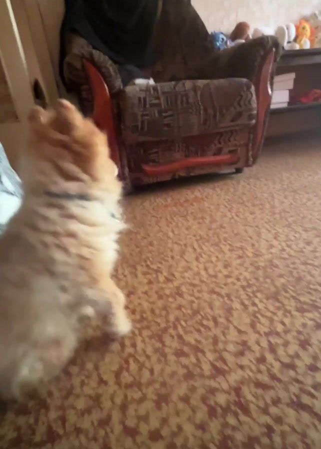 A small, fluffy, orange Pomeranian dog stands on a patterned brown and gold floor, looks up at the camera, and sticks out its tongue. The dog wears a blue collar. The camera is held low, close to the dog, and is slightly unsteady. In the background, a brown patterned armchair with red accents is visible, along with a grey and white patterned blanket. The lighting appears to be indoor, and the room looks lived-in.