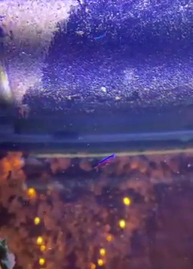 n aquarium with fish swimming inside. The water is slightly murky. There's a blue and red fish, possibly a neon tetra, swimming in the middle of the tank. The top edge of the tank has some build-up. The background includes some blurred orange and brown elements. The camera angle is low, looking upwards into the tank.