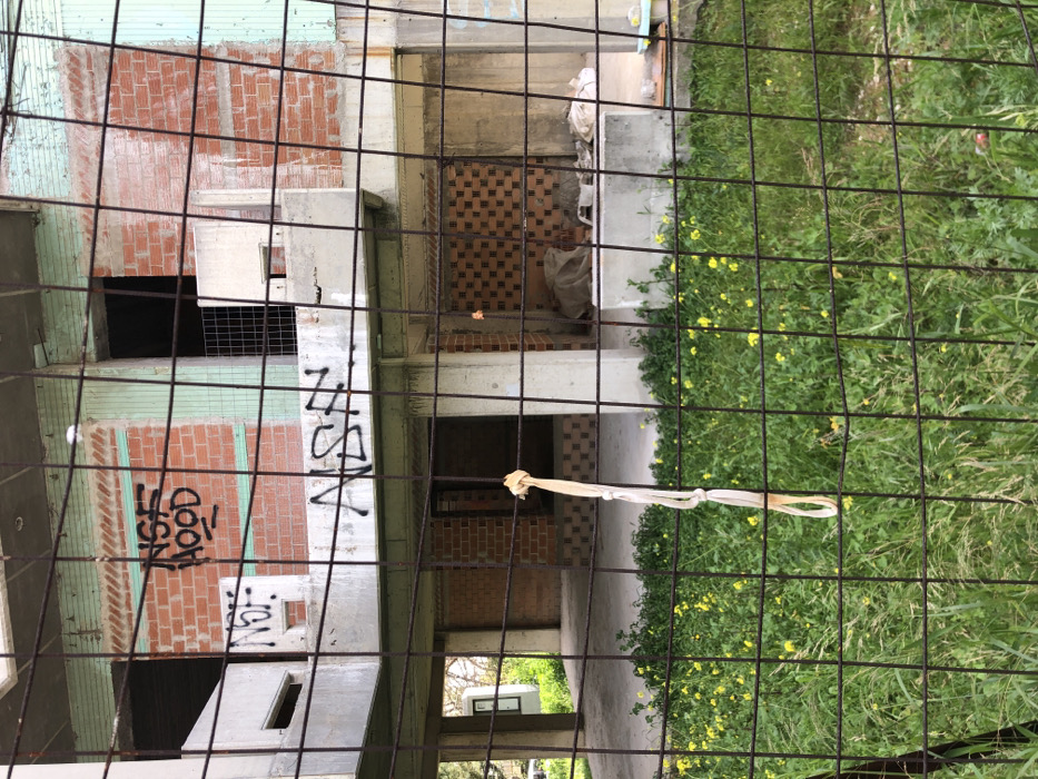 A view through a black metal fence looking into an abandoned, partially constructed building