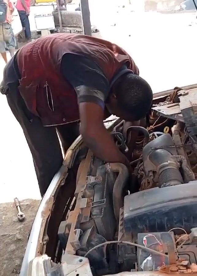 A man wearing a red vest and dark pants is working on the engine of a car. He is bent over the engine bay, focusing on the engine components. The car appears to be old and somewhat worn. A wrench lies on the ground near the car. In the background, several other people are present, some standing and observing. The scene takes place outdoors, possibly at a mechanic's shop or repair area. There are buildings and other cars visible in the distance. The lighting suggests it is daytime. The overall atmosphere seems to be one of activity and repair work.
