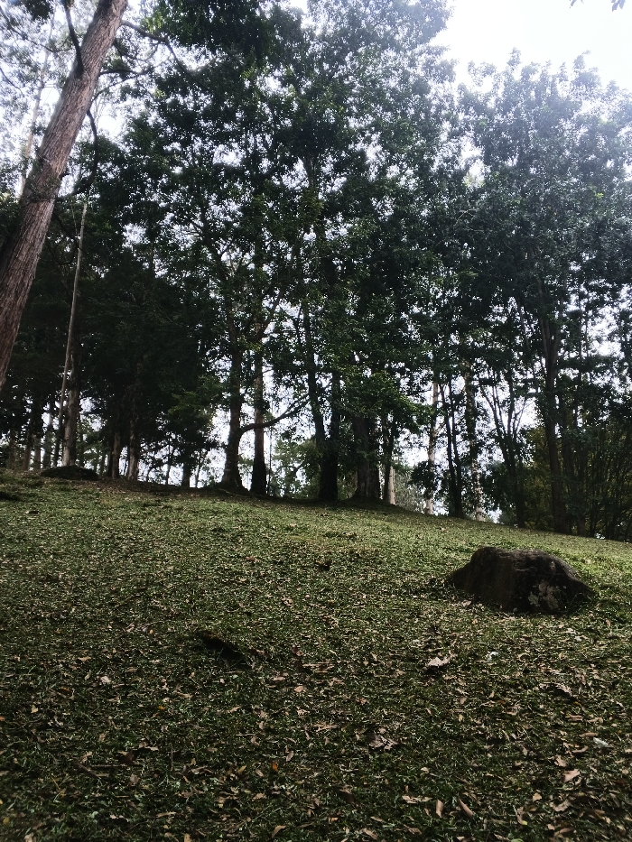 A grassy hillside dotted with fallen leaves slopes upward toward a line of tall trees. Sunlight filters through the canopy, illuminating patches of the hillside. A large rock sits on the right side of the frame. The trunks of the trees are visible against the sky, adding depth to the scene.