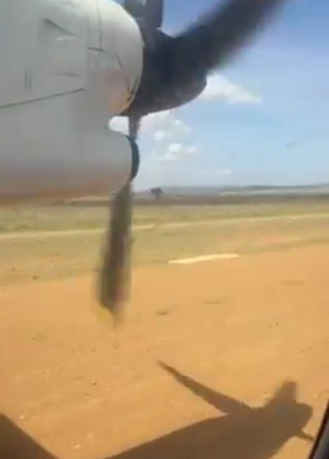 The view from the window of a small aircraft shows the plane on the ground, with its propeller spinning. The ground is red dirt, and in the distance, the terrain is flat with sparse vegetation. The sky is blue with scattered clouds. The shadow of the aircraft's wing is visible on the ground below the window.