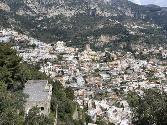 The image displays a panoramic view of Positano, Italy, with the town's buildings integrated into a steep mountainside under daylight conditions