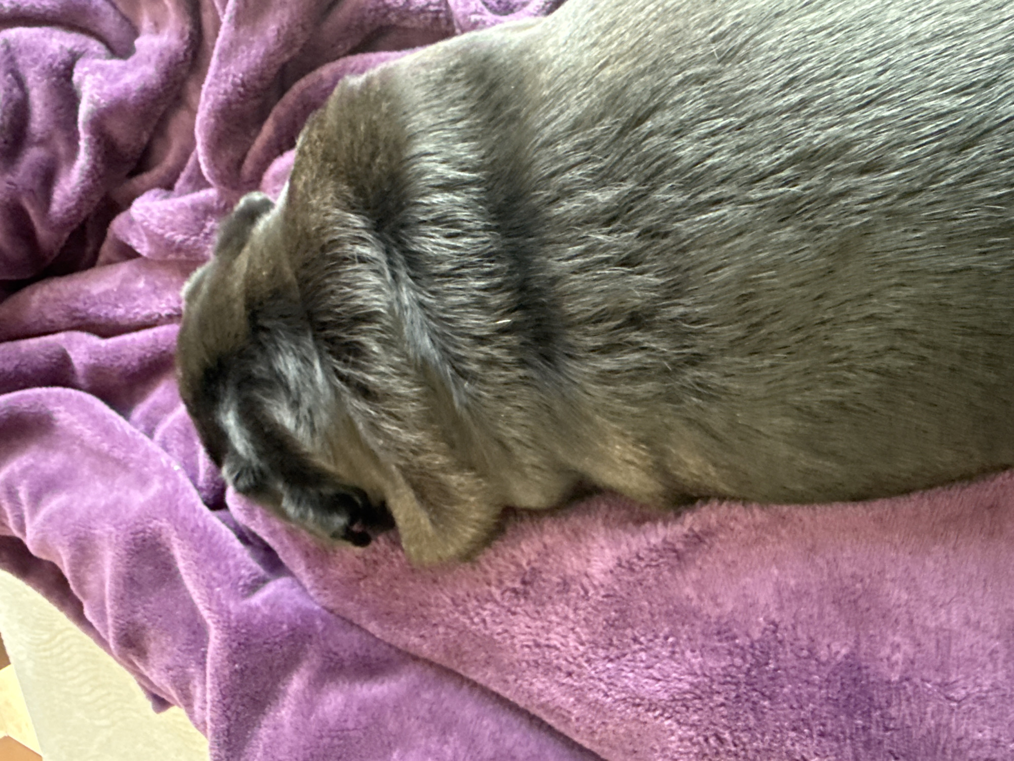 A gray pug is resting on a purple blanket
